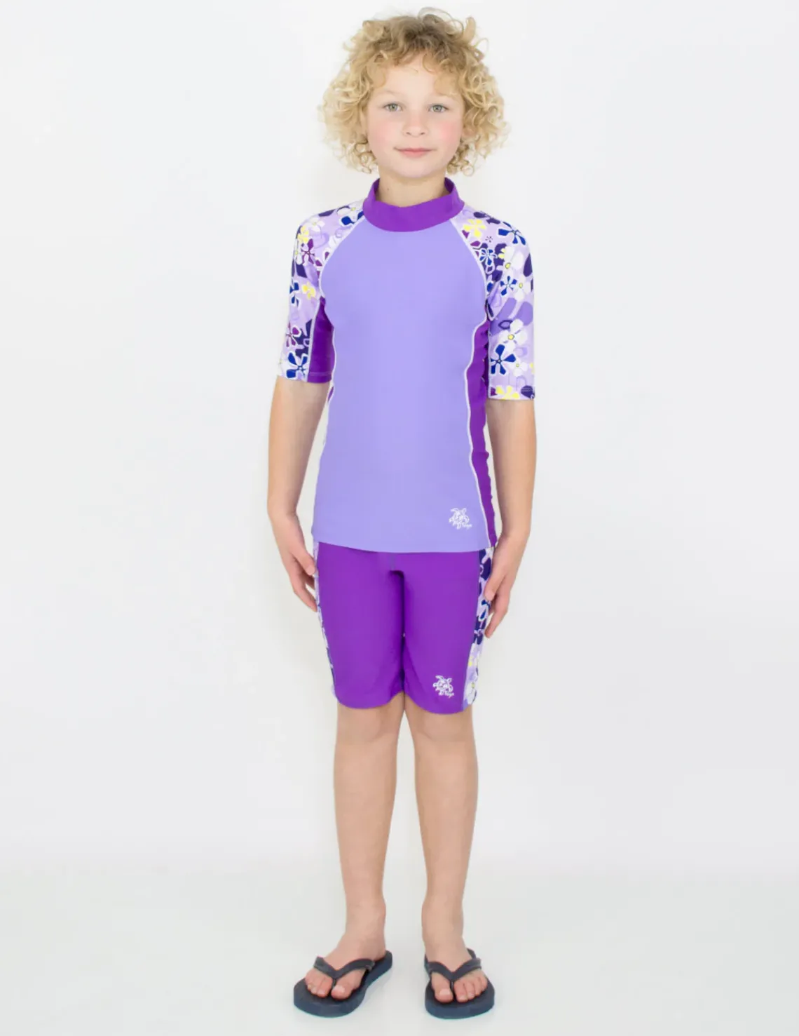 Seaside 2-piece swim set offers both sun protection and a fashionable look. All Tuga girls swim shirts are designed with a high neck style to offer the most sun protection. Our jammer swim shorts offer versatility, modesty, and comfort. Available for girls 4 years to 14 years.