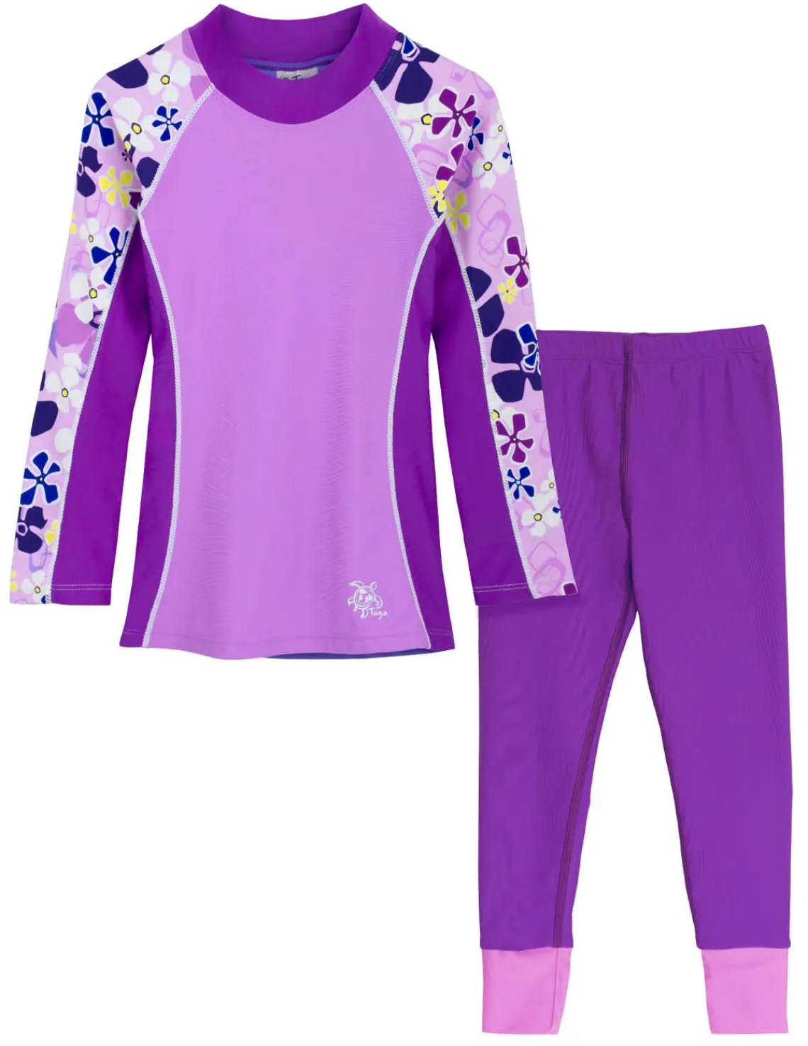 Shoreline 2-piece swim set offers both sun protection and a fashionable look. All Tuga girls swim shirts are designed with a high neck style to offer the most sun protection. Our swim leggings offer versatility, modesty, and, of course, comfort. Available for girls 4 to 14 years.
