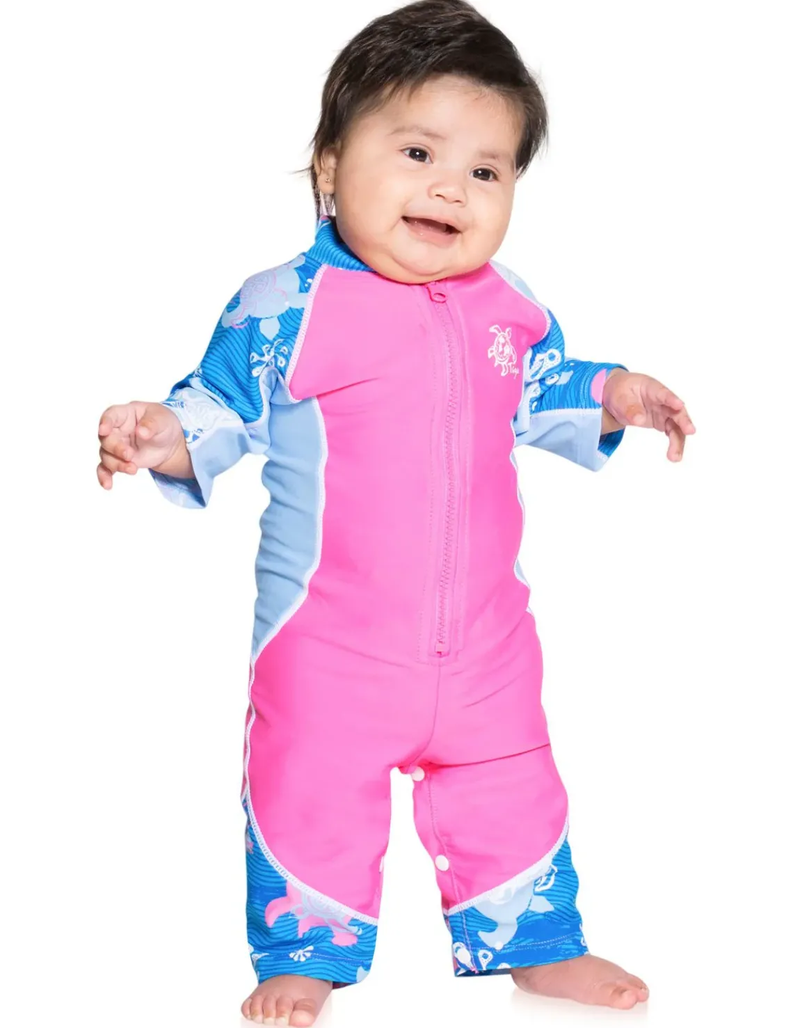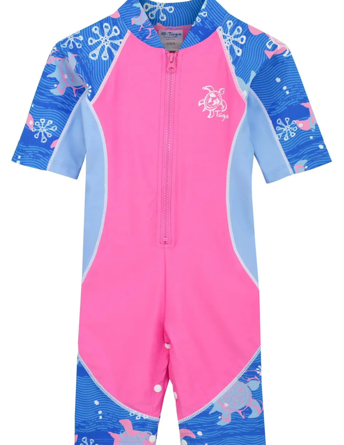 The Tuga girls “low tide” is a great option for younger kids and available in sizes 3/6 months up to 6/7 years. It is an adorable one-piece sunsuit that covers from above-the-elbow to above the knee with front logo, easy on/off front zipper, zipper flaps behind zipper protect their delicate skin when zipping/unzipping, and our adorable Tuga print. Sizes 3/6 mos, 6/12 mos, 12/18 mos and 2/3 yrs have snaps on the inside of legs for easy diaper changing. Available for baby girls, infants and toddlers from 3 months up to 7 years.