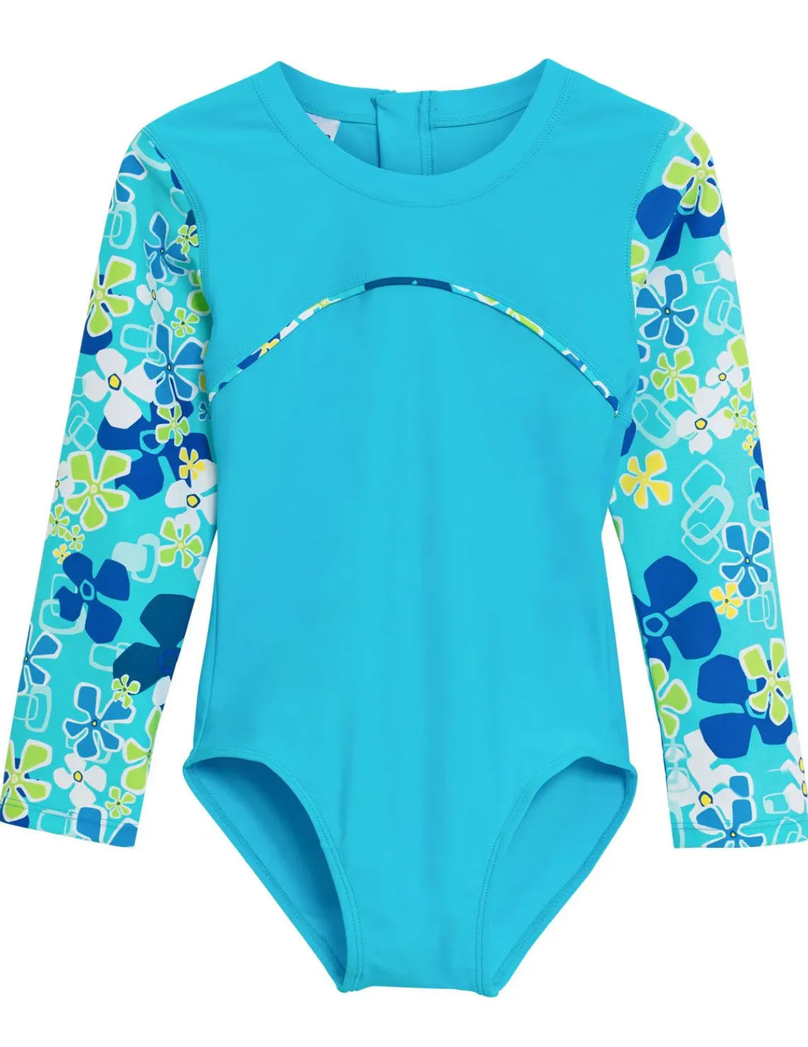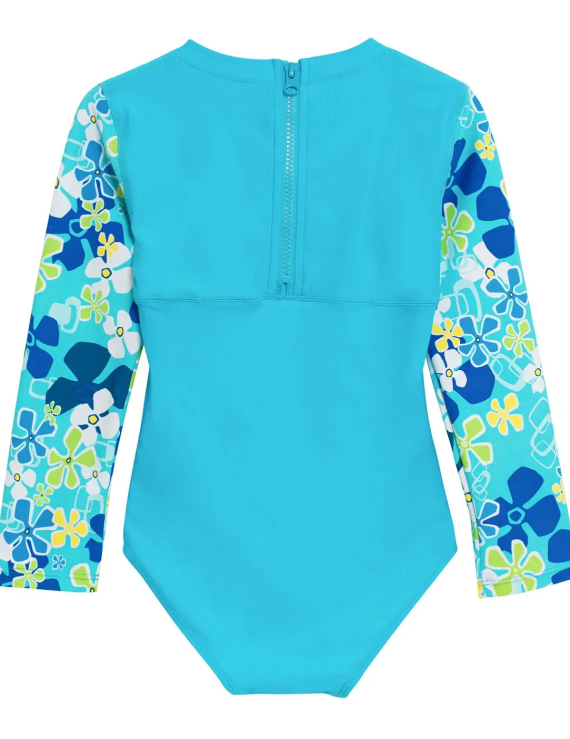 Our newest addition is our stylish one piece in our signature Tuga floral prints. All over floral print on sleeves, contrast detail seam at front, back zipper for sizes 4/5 years and larger, snaps for sizes 2/3 years and younger make is easy for diaper changing.