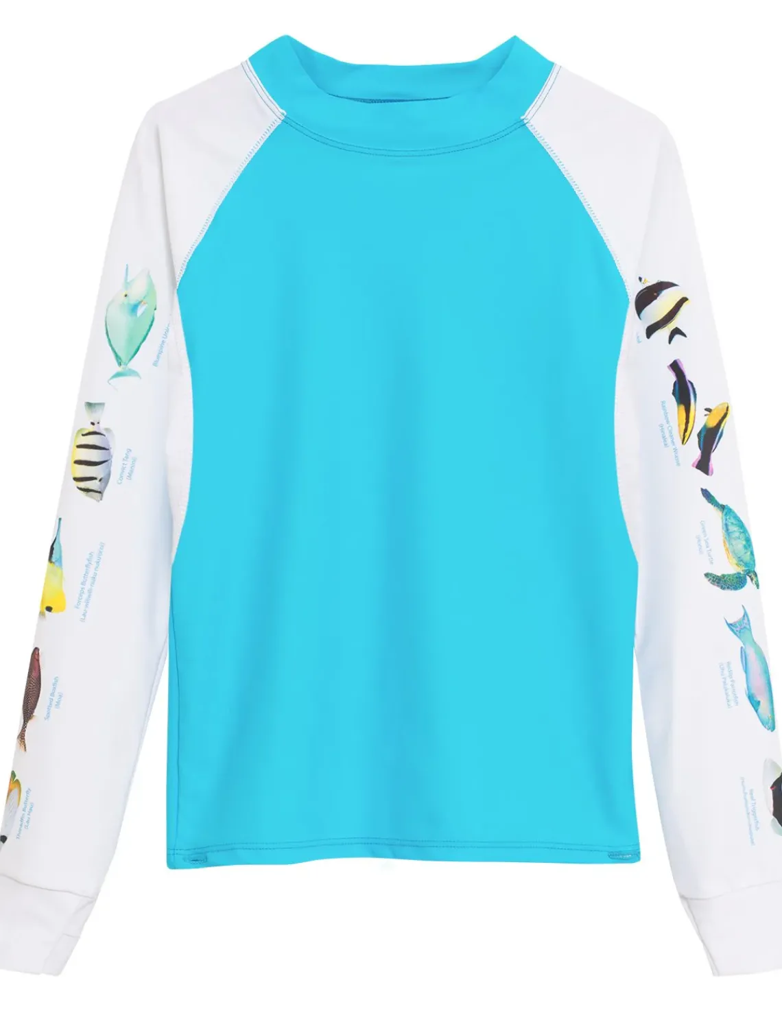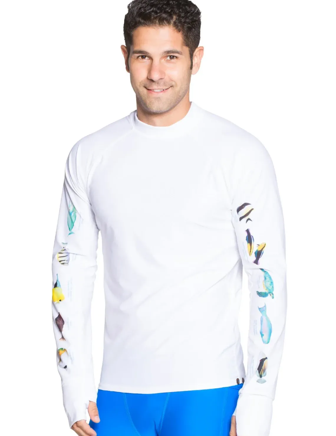 Perfectly designed collection for water activities from snorkeling to paddle boarding. Our very unique FISH ID swim shirts are educational and fun. Featuring 5 real photos of local Hawaii fish on each sleeve with the fish’s name and the Hawaiian name. Swim shirts with thumb hole cuffs to keep sleeves from riding up, a regular fit for an easy swim, and button holes at hem to easily attach to our Tuga snorkeling swim bottoms.