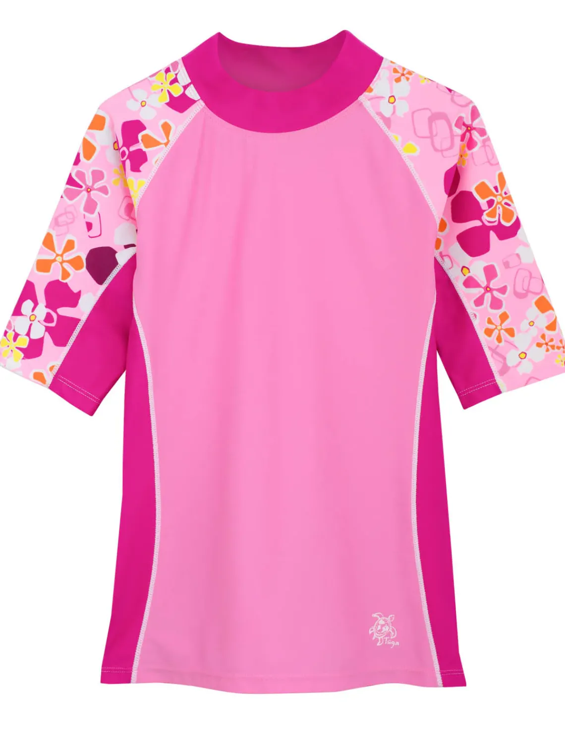 Our Seaside girls rashguards are designed with an attractive solid and print combination to offer a fashion-oriented swim shirt popular with girls of all ages. All Tuga girls swim shirts are designed with a high neck style to offer the most sun protection. Match it up with our Tuga girl’s swim shorts, our swim diapers for the little ones and our sun hats! Available for toddler girls 4 years up to 14 years.