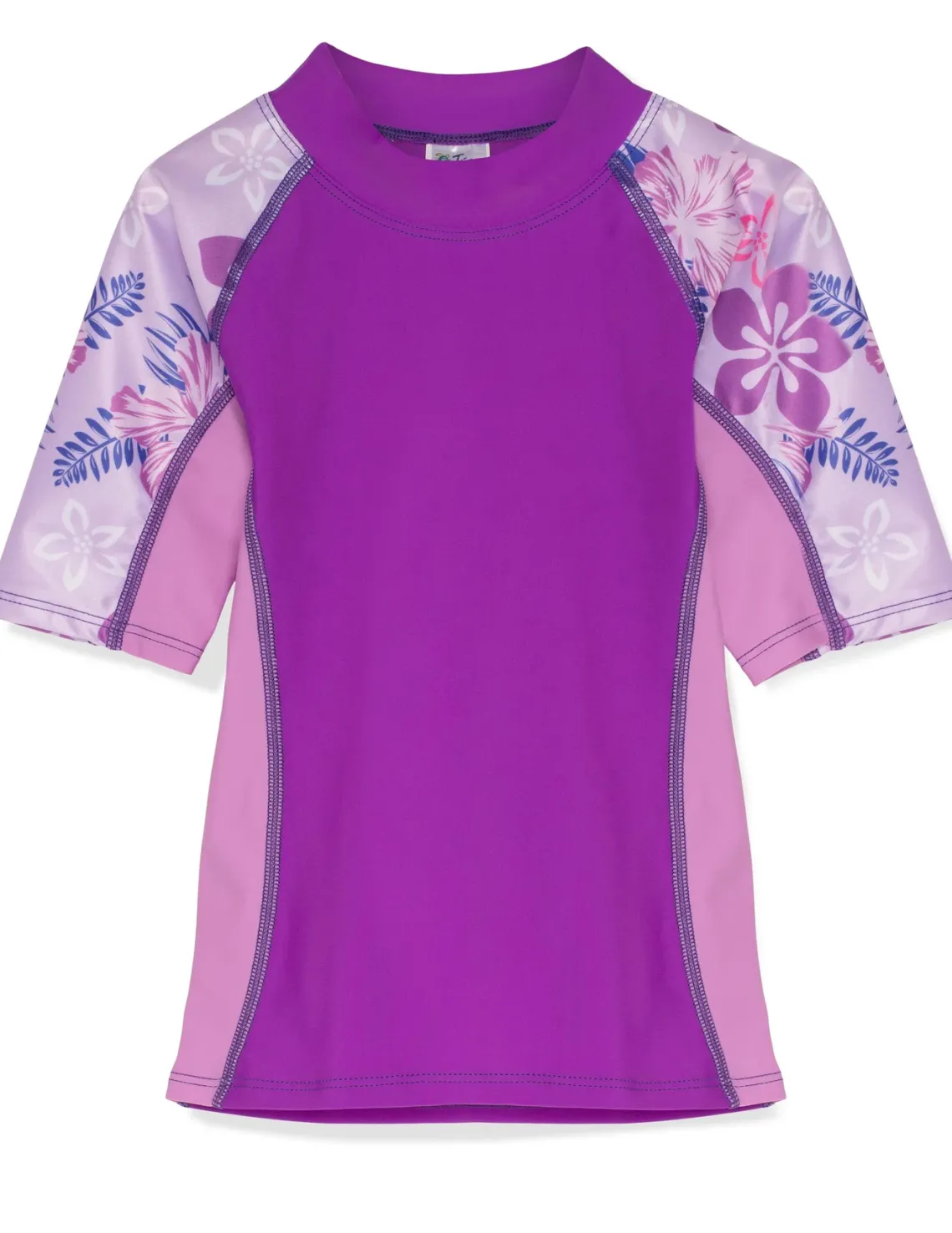 Our Seaside girls rashguards are designed with an attractive solid and print combination to offer a fashion-oriented swim shirt popular with girls of all ages. All Tuga girls swim shirts are designed with a high neck style to offer the most sun protection. Match it up with our Tuga girl’s swim shorts and our sun hats! Available for toddler girls 4 years up to 14 years.