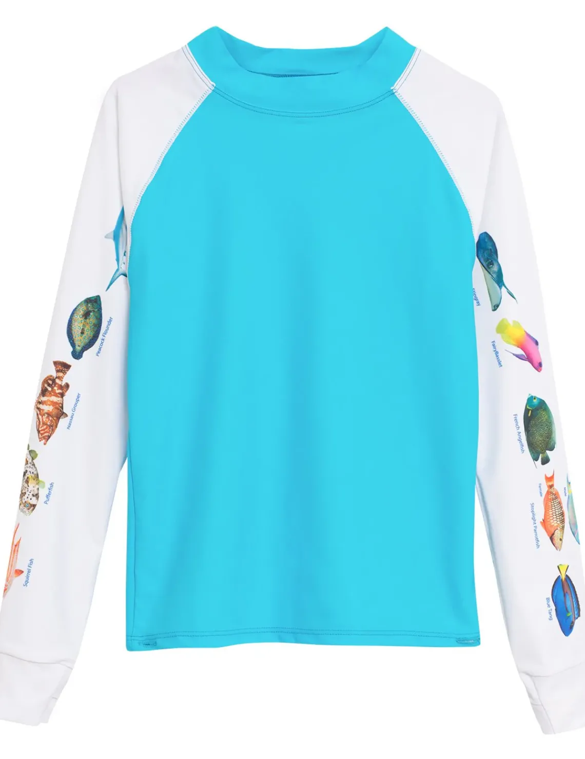 Perfectly designed collection for water activities from snorkeling to paddle boarding. Our very unique FISH ID swim shirts are educational and fun. Featuring 5 real photos of local Caribbean fish on each sleeve with the fish’s name. Swim shirts with thumb hole cuffs to keep sleeves from riding up, a regular fit for an easy swim, and button holes at hem to easily attach to our Tuga snorkeling swim bottoms.