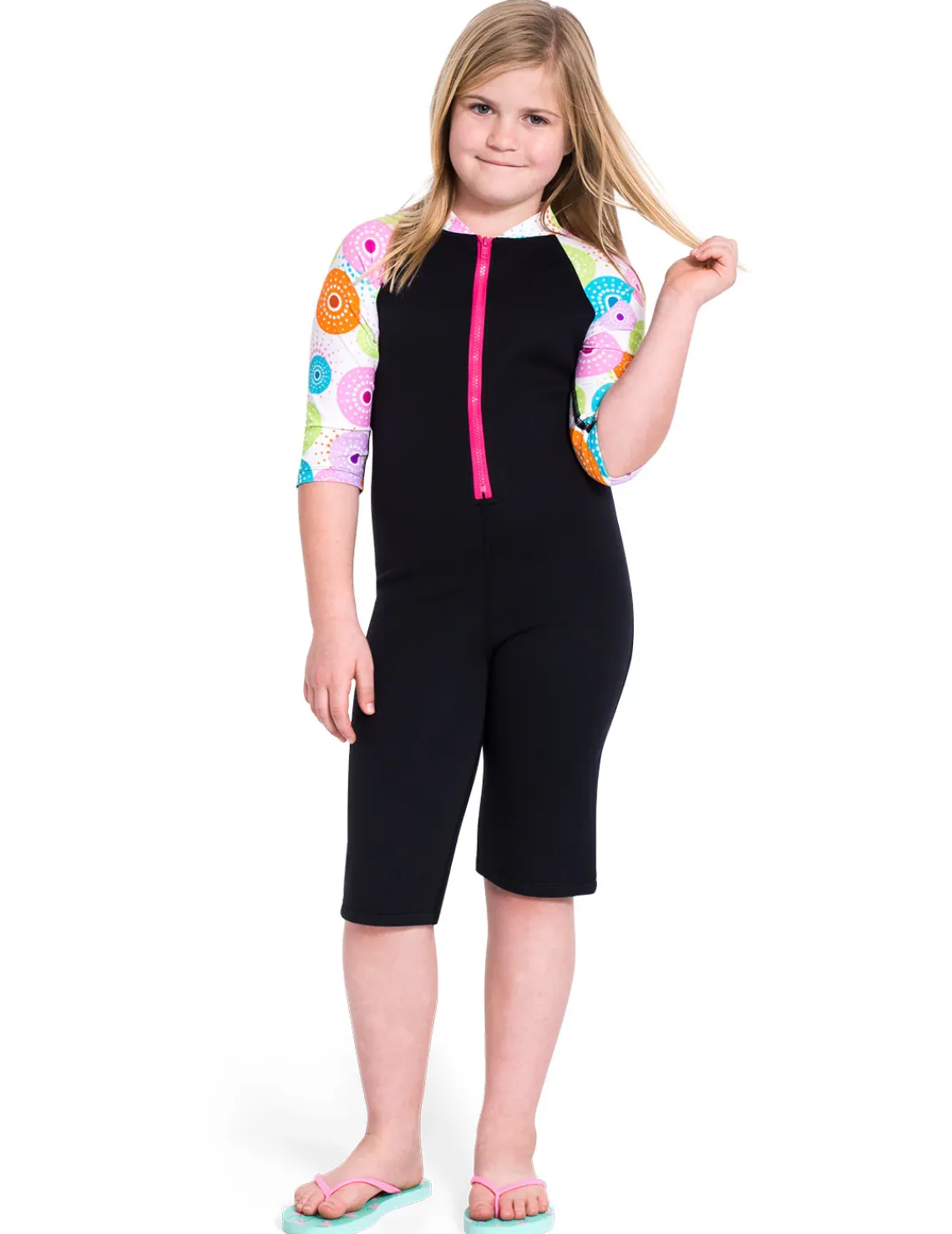 Keep your little ones warm with Tuga warm thermal suits. These suits feature 1mm neoprene on the main body part of the suit for warmth and nylon/spandex sleeves to allow for free arm movement. Perfect for swimming lessons! Front zippers made of durable plastic and make for easy on and off. Plus a zipper flap to keep the zipper away from their skin. Available in our Tuga print or solid sleeves. And they are UPF50+ sun protective. The perfect suit to keep them from shivering!
