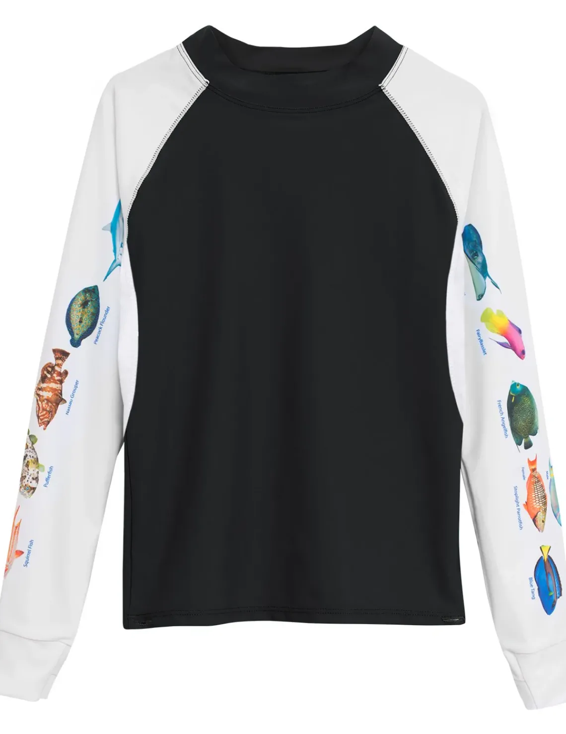 Perfectly designed collection for water activities from snorkeling to paddle boarding. Our very unique FISH ID swim shirts are educational and fun. Featuring 5 real photos of local Caribbean fish on each sleeve with the fish’s name. Swim shirts with thumb hole cuffs to keep sleeves from riding up, a regular fit for an easy swim, and button holes at hem to easily attach to our Tuga snorkeling swim bottoms.