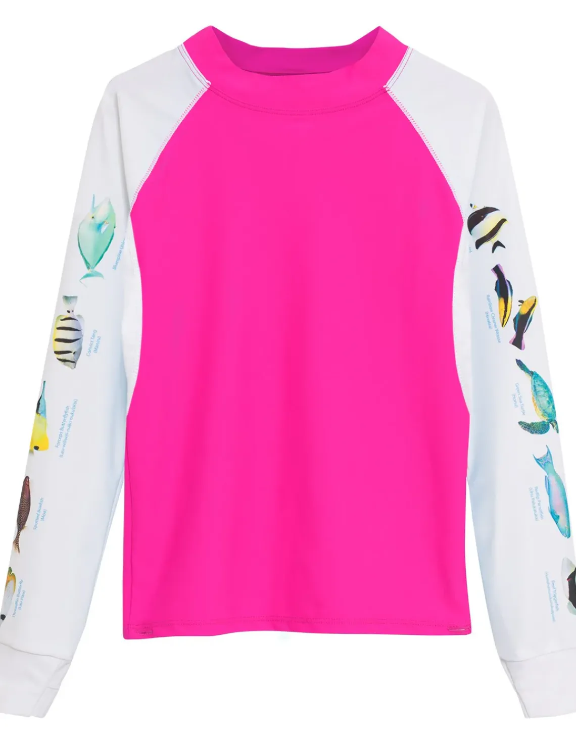 Perfectly designed collection for water activities from snorkeling to paddle boarding. Our very unique FISH ID swim shirts are educational and fun. Featuring 5 real photos of local Hawaii fish on each sleeve with the fish’s name and the Hawaiian name. Swim shirts with thumb hole cuffs to keep sleeves from riding up, a regular fit for an easy swim, and button holes at hem to easily attach to our Tuga snorkeling swim bottoms.