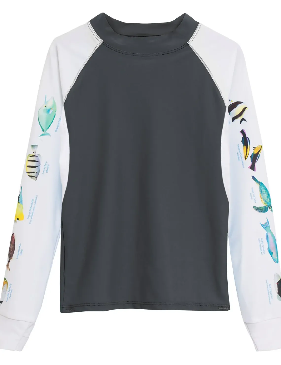 Perfectly designed collection for water activities from snorkeling to paddle boarding. Our very unique FISH ID swim shirts are educational and fun. Featuring 5 real photos of local Hawaii fish on each sleeve with the fish’s name and the Hawaiian name. Swim shirts with thumb hole cuffs to keep sleeves from riding up, a regular fit for an easy swim, and button holes at hem to easily attach to our Tuga snorkeling swim bottoms.